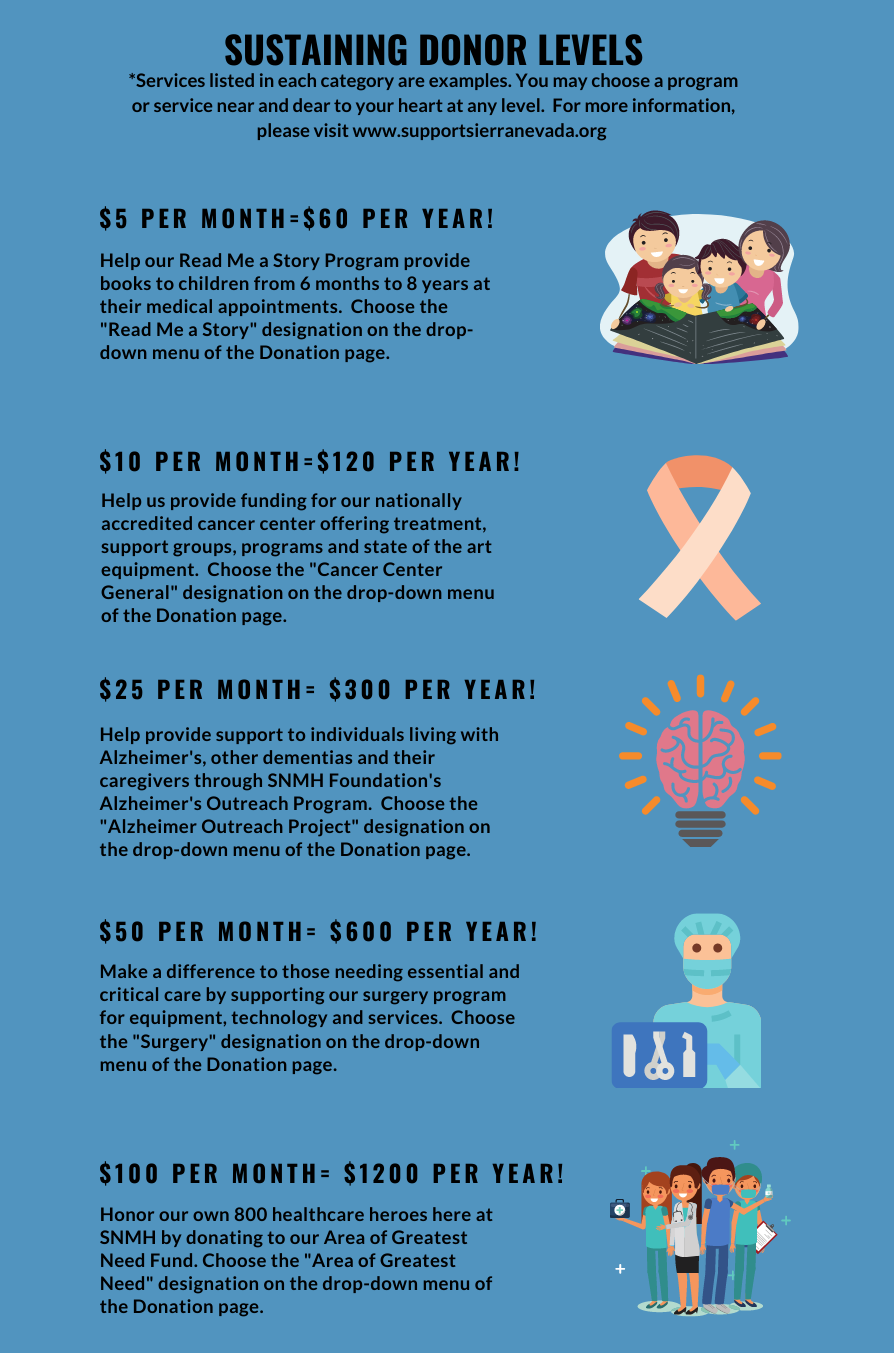 If you prefer, you can also set up a recurring payment by calling SNMH Foundation at (530) 477-9700.